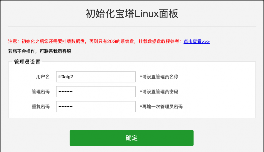 訪問后會出現(xiàn)如圖所示的頁面,請在頁面中設置你的寶塔登錄信息,必須把這個用戶名密碼記住,不然以后無法登錄寶塔