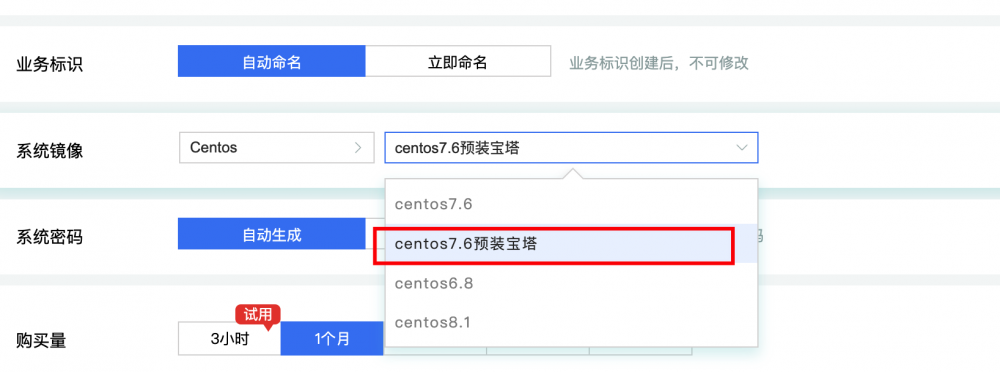如上圖所示,選擇好規(guī)格,然后滑到最底部,選擇系統(tǒng)鏡像為centos7.6預裝寶塔,其他所有配置項都默認即可。
