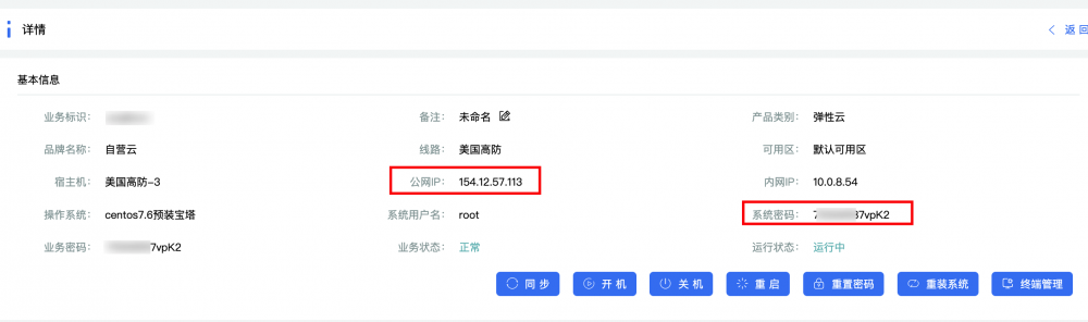 購買完成后,進入控制臺-云計算-云服務器,點擊右側的管理,就可以看到服務器的詳細信息,這里面我們只需要知道 服務器公網(wǎng)IP、系統(tǒng)密碼。