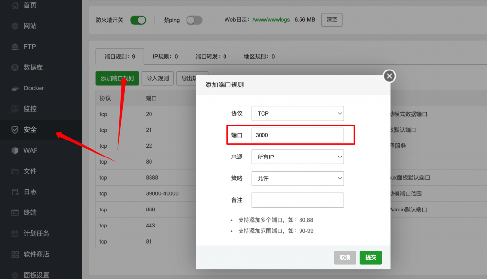 更新完成后,還需要做一件事就是放行端口,這里我們點擊寶塔面板左側的安全,點擊添加端口規(guī)則,添加3000端口后,提交即可